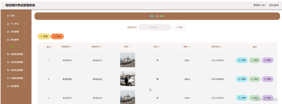 教练管理,在教练管理页面可以对教练账号、教练姓名、头像、性别、教练、联系电话等内容进行查看详情、修改或删除、新增等操作,教练管理页面如图5-11所示。