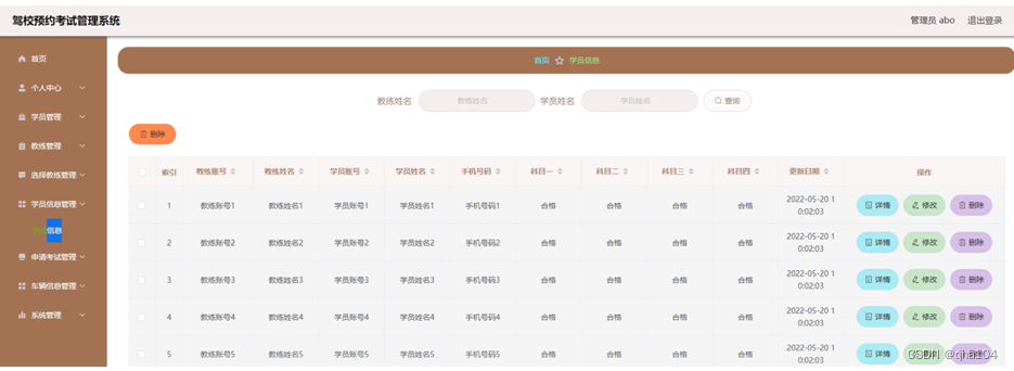 在学员信息管理页面,管理员可以查看教练账号、教练姓名、学员账号、学员姓名、手机号码、科目一、科目二、科目三、科目四、更新时间等信息,并进行修改、删除或查询等操作,如图5-13所示。