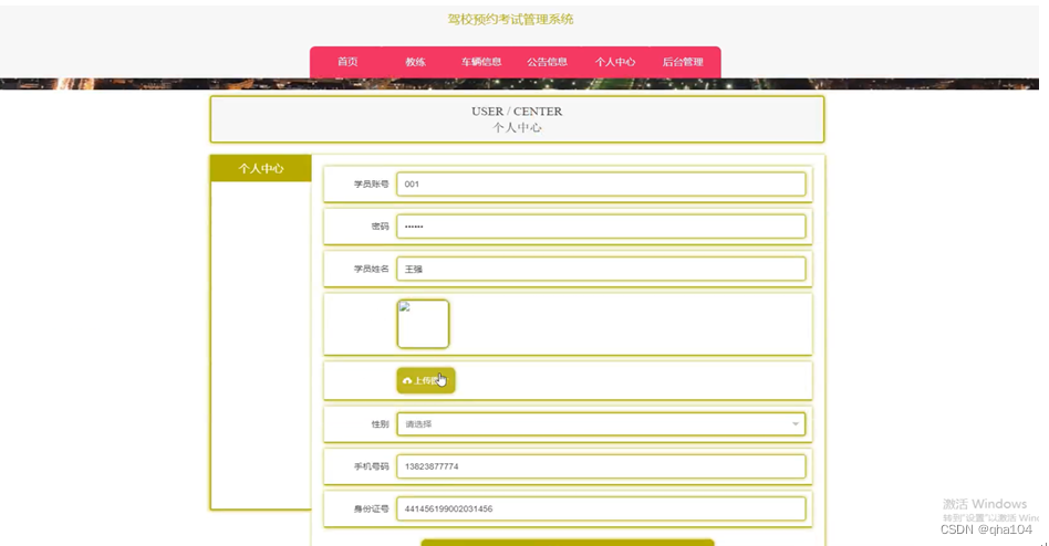 在个人中心页面,学员可以输入学员账号、密码、学员姓名、上传图片、性别、手机号码、身份证号来更新个人信息,个人中心页面如图5-5所示。