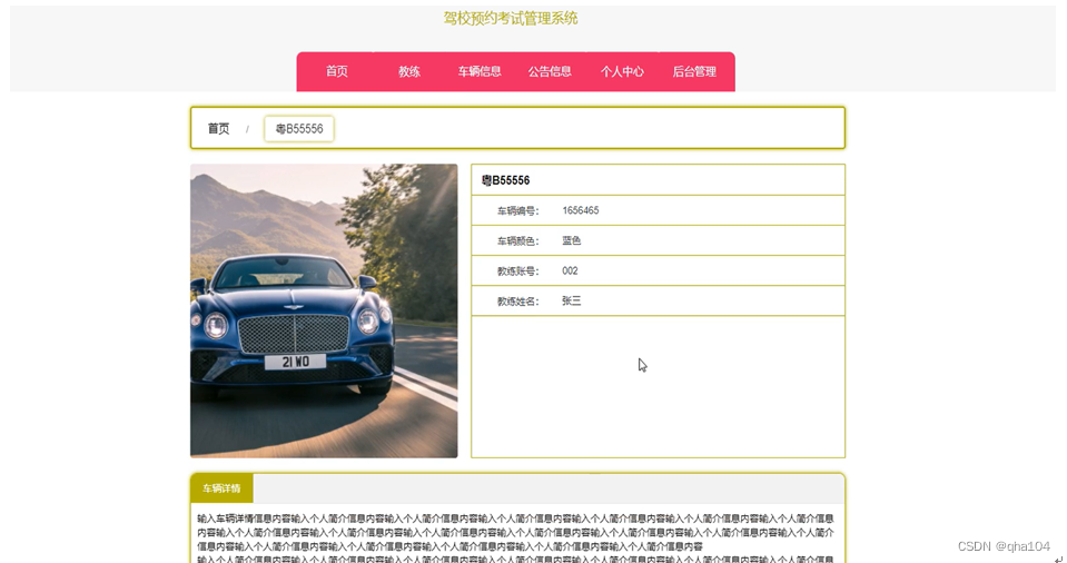 车辆信息,在车辆信息页面可以查看车辆编号、车牌号、图片、车辆颜色、教练账号、教练姓名、车辆详情等信息,车辆信息页面如图5-3所示。