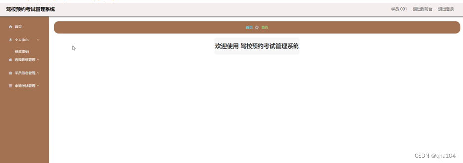 点击后台管理,页面跳转到学员后台管理页面,学员可以对个人中心、选择教练管理、学员信息管理、申请考试管理这四个功能模块进行操作,学员后台管理页面如图5-6所示。