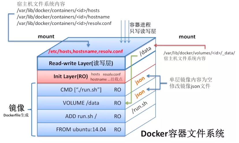 读写层: Docker容器内的进程只对可读可写层拥有写权限,其它层进程而言都是只读的(Read-Only)。关于VOLUME以及容器的host、hostname、resolv.conf文件都会挂载到这里