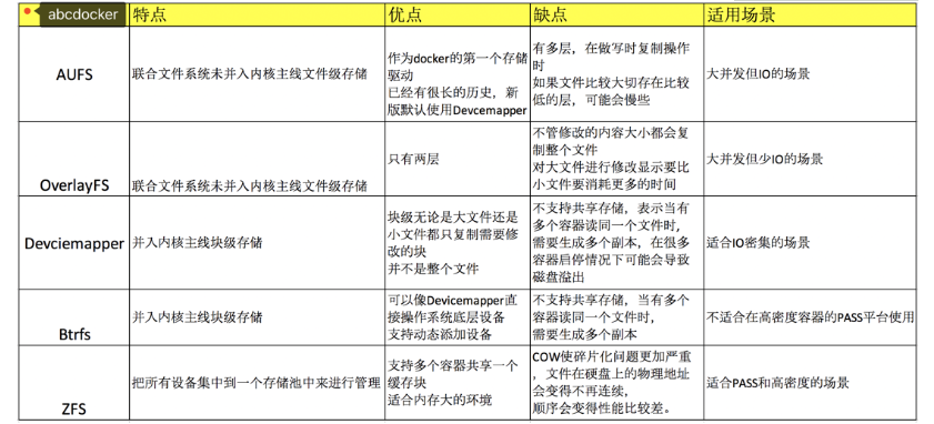 Docker最开始采用AUFS作为文件系统,也得益于AUFS分层的概念,实现了多个Container可以共享一个image。但是由于AUFS未并入Linux内核,且只支持Ubuntu,考虑到兼容性问题,在Docker 0.7 版本中引入了存储驱动,目前,Docker支持AUFS、Btrfs、Devicemapper、OverlayFS、ZFS五种存储驱动。