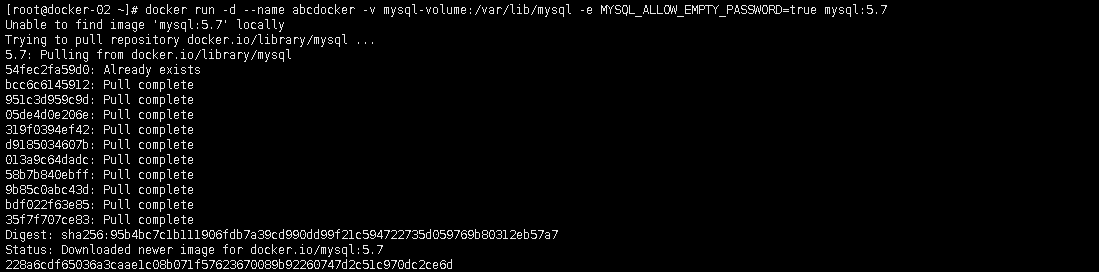 [root@docker-02 ~]# docker run -d --name abcdocker -v mysql-volume:/var/lib/mysql -e MYSQL_ALLOW_EMPTY_PASSWORD=true mysql:5.7