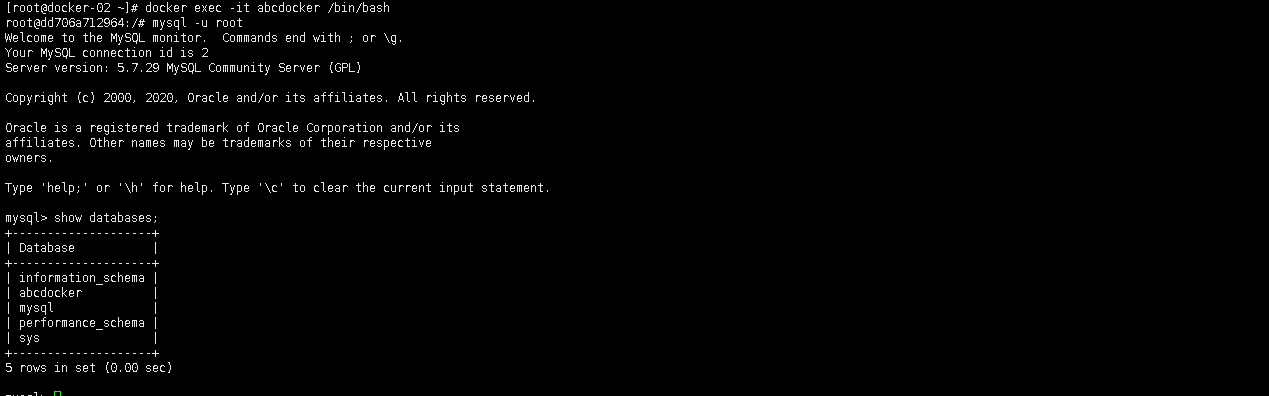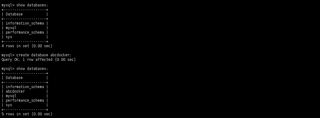 dd706a712964 mysql:5.7 "docker-entrypoint..." 26 seconds ago Up 25 seconds 3306/tcp, 33060/tcp abcdocker查看是否有abcdocker数据库