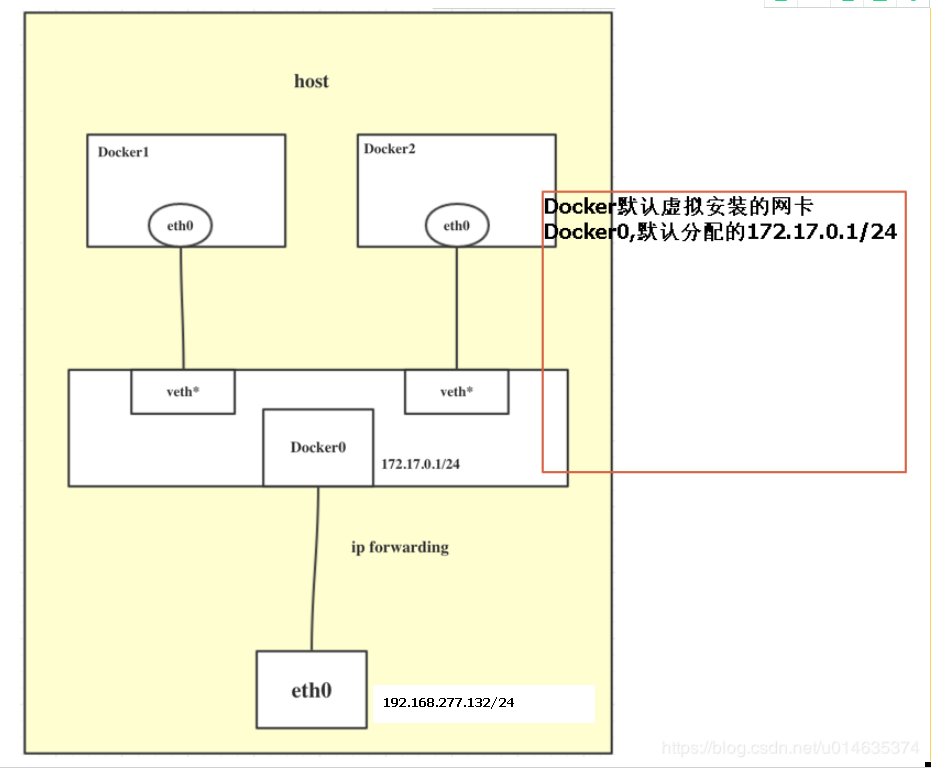 当Docker进程启动时,会在主机上创建一个名为Docker0的虚拟网桥,此主机上启动的Docker容器默认会连接到这个虚拟网桥上。虚拟网桥的工作方式和物理交换机相似,这样主机上的所有容器就通过交换机连在了一个二层网络中。从docker0子网中分配一个IP给容器使用,并设置docker0的IP地址为容器的默认网关。在主机上创建一对虚拟网卡veth pair设备,Docker将veth pair设备的一端放在新创建的容器中,并命名为eth0(容器内部网卡),另一端在放在主机中,以vethxxx这样类似的名称命名,并将这个网络设备加入到docker0网桥中。可以使用brctl show命令查看