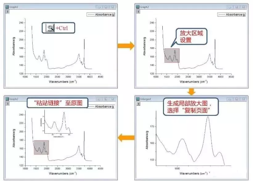 很多时候,局部放大也是非常必要的,因为有些细节在整体图线中无法显示,利用左侧工具栏的缩放+Ctrl可以在原图中插入局部放大图,也可以执行Plot>Specialized>Zoom,将曲线细节放大,展示给读者看。