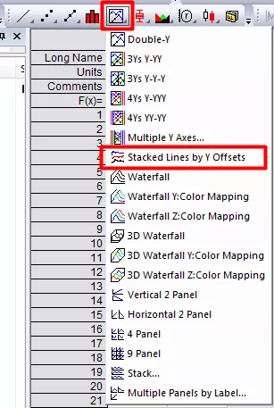 Book中的各列设置好XYXYXY后,全选数据,不要点击作线图,长按线图工具栏里的第五个图标,选择stacked lines by Y offsets作图(Y偏移堆积线图)(也可以通过依次点击Plot,Y-offset/Waterfall,stacked lines by Y offsets实现)。
