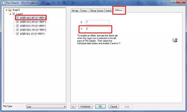 若要调整曲线间距,双击曲线,弹出对话框,点击Offset标签,此时显示第一条曲线的Y轴偏移量为0,即不偏移。在左侧点击第二条曲线,此时可修改第二条曲线相对于第一条曲线的Y轴偏移量。同理,依次修改各条曲线的偏移量。点击Apply,可随时观察是否偏移到合适的位置。