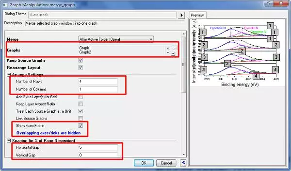 在弹出的对话框中设置合并效果。在Graphs里设置要合并的图以及顺序,在Rows和Columns里设置如何摆放这些图,show axes frame去掉一些多余的元素,因为是四张图垂直排列,所以垂直方向间隙vertical gap设置为0,点击ok。