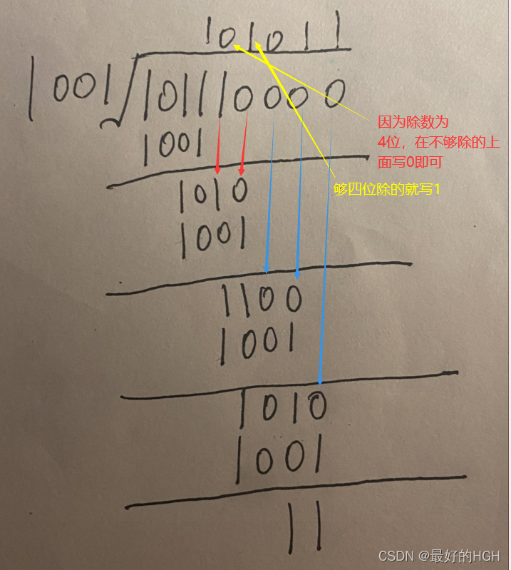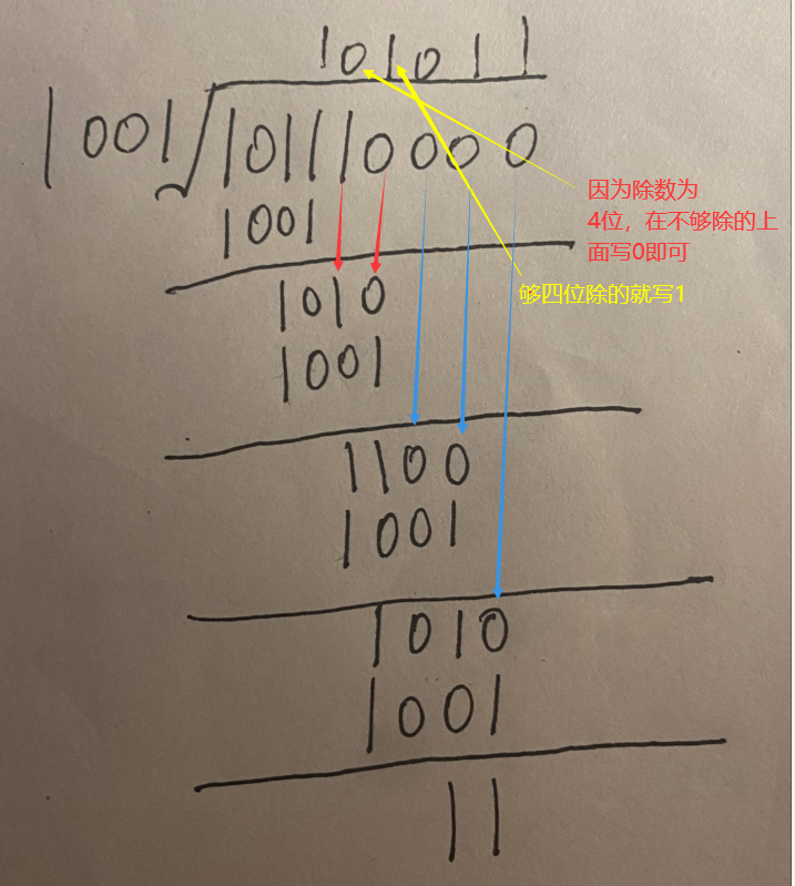 如上图,可得余数为11,但这不是我们最终的余数R,余数R的位数应该和我们补的0一样位数,所以在它前面添0即可,也就是R=011。