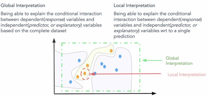 - 本地还是全局?这种解释分类讨论了解释方法是解释单个预测还是整个模型行为?或者如果范围介于两者之间?我们将很快谈论全球和地方的解释。