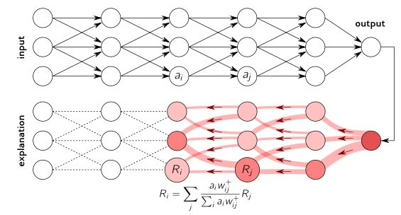 逐层相关性传播(LRP)是一种通过在神经网络中运行反向传递来识别重要像素的方法。向后传递是保守的相关再分配过程,其中对较高层贡献最大的神经元从其获得最大相关性。 LRP程序如下图所示。