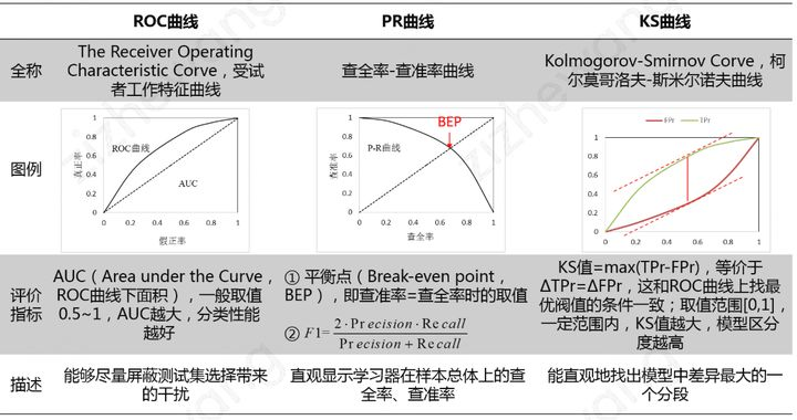 - KS(Kolmogorov-Smirnov Curve)曲线横轴为不同的分类阈值,纵轴为真正率(TPr)和假正率(FPr)的变化曲线。KS值=max|TPr-FPr|,等价于ΔTPr=ΔFPr,这和ROC曲线上找最优阈值的条件一致。KS值常在征信评分模型中用于衡量区分预测正负样本的分隔程度。一般来说,KS值越大,表明正负样本区分的程度越好,说明模型区分度越高。但并非所有的情况KS值都是越高越好的,尤其在征信模型中,如正负样本完全分错的情况下,KS值依旧可以很高。征信模型最期望得到的信用分数分布为正态分布,如果KS值过大,如0.9,就可以认为正负样本分得过开了,不太可能是正态分布,反而比较可能是极端化的分布状态(如U字型),这样的分数就很不好,基本可以认为不可用。