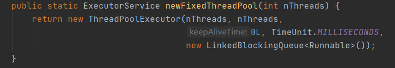 这个线程池实现特点是核心线程数和最大线程数是一致的,然后 keepAliveTime 的时间是 0 ,队列是无界队列。