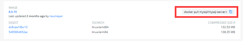 最后选择的是上图的 mysql/mysql-server:8.0.19,原因无它:arm64+mysql8,综合一下就选择了这个。