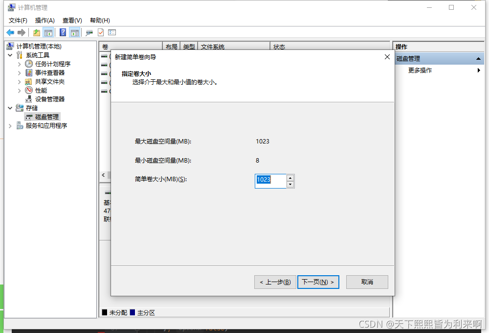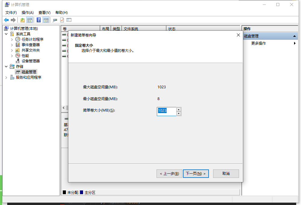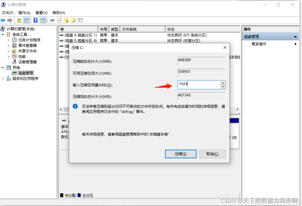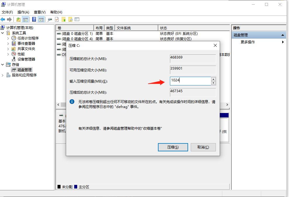 5.在弹出的窗口,输入您需要新建磁盘的大小,注意压缩空间量必须小于可用压缩空间大小,否则会失败