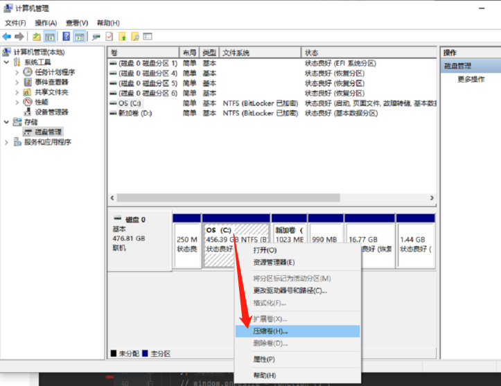 3. 右边鼠标移动C盘上右键选择【压缩卷】