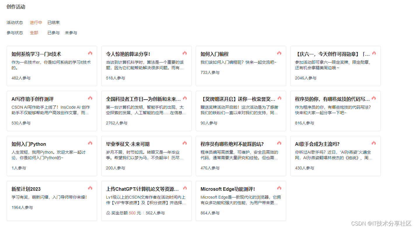 目前CSDN的发文活动还是很多的,比如原力计划、1024程序员节等等发文活动,建议大家积极参与这些发文活动,它不仅能够大大增加你的文章曝光度、针对优秀的文章还有机会获得官方的礼品、实体奖品、证书等等,还是非常有成就感的。