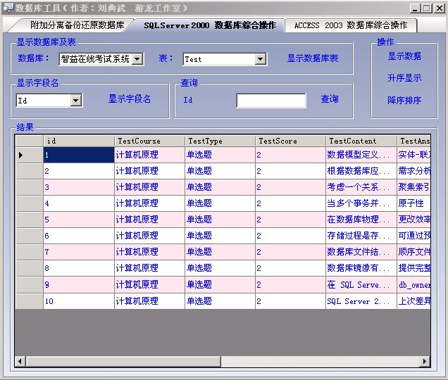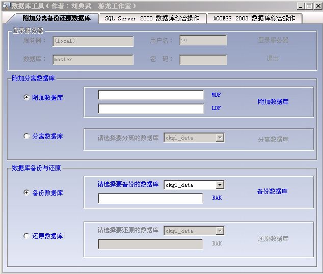 Sql Server 2000数 据库的一个综合操作工具,登陆到服务器后,会自动检索到服务器上面的所有数据库,可以对数据库进行附加分离备份还原操作,同时可以查看到数据库中的所有 表,表中的所有字段,可以显示数据库表中的数据库,同时还可以按照输入的要求查询信息。使用方便快捷,开发动因是自己经常要附加数据库和查看数据库表记录 操作,打开企业管理器太慢,使用程序方便快捷。