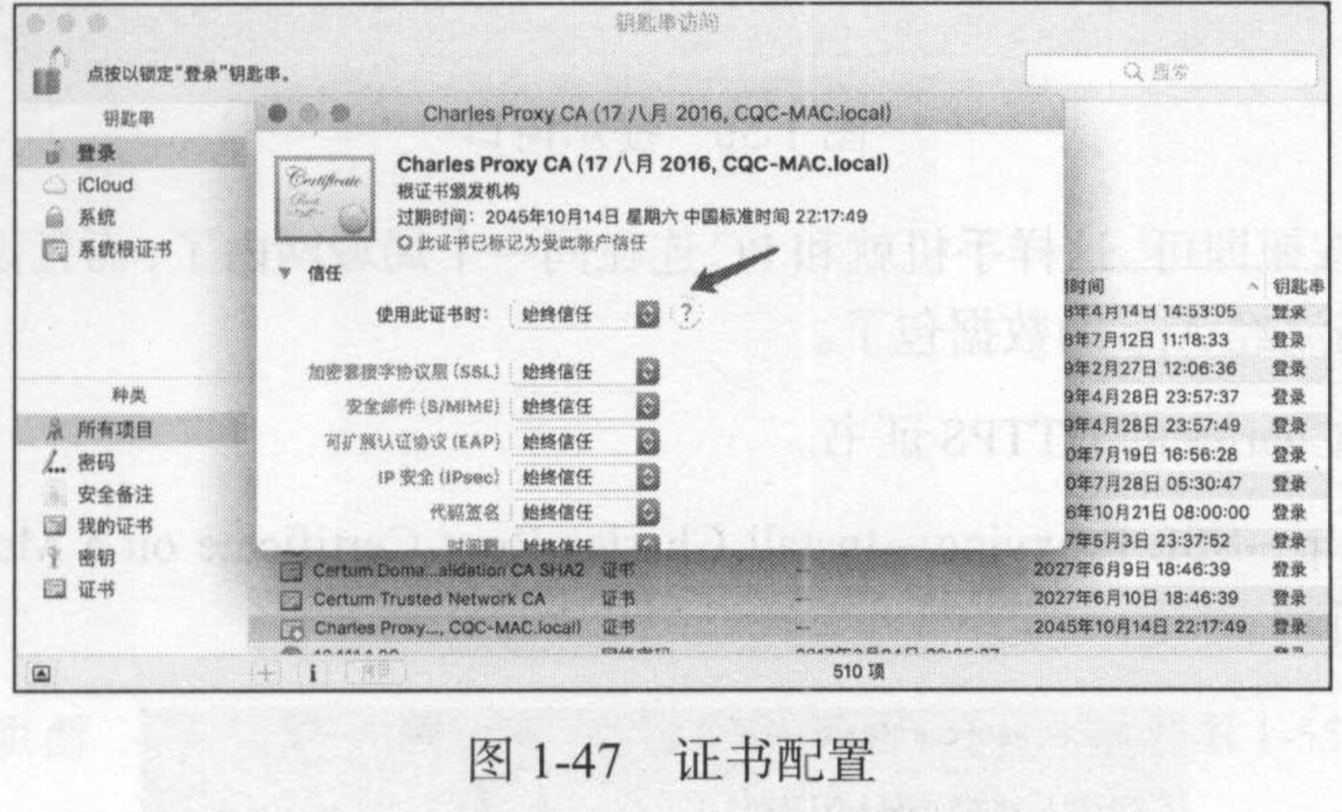 接下来,找到 Charles 的证书并双击,将“信任”设置为“始终信任” ” •111:1.•ir:·u ...