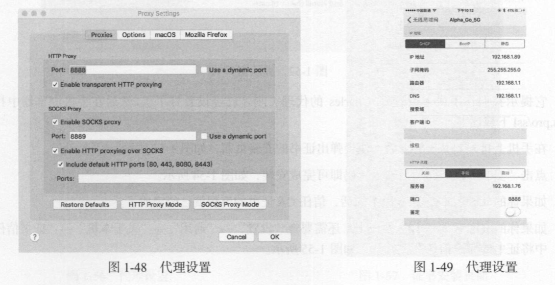接下来,将手机和电脑连在同一个局域网下 。 例如,当前电脑的 IP为 192.168.1.76,那么首先设 置手机的代理为 192.168.1.76:8888,如图 1-49所示。