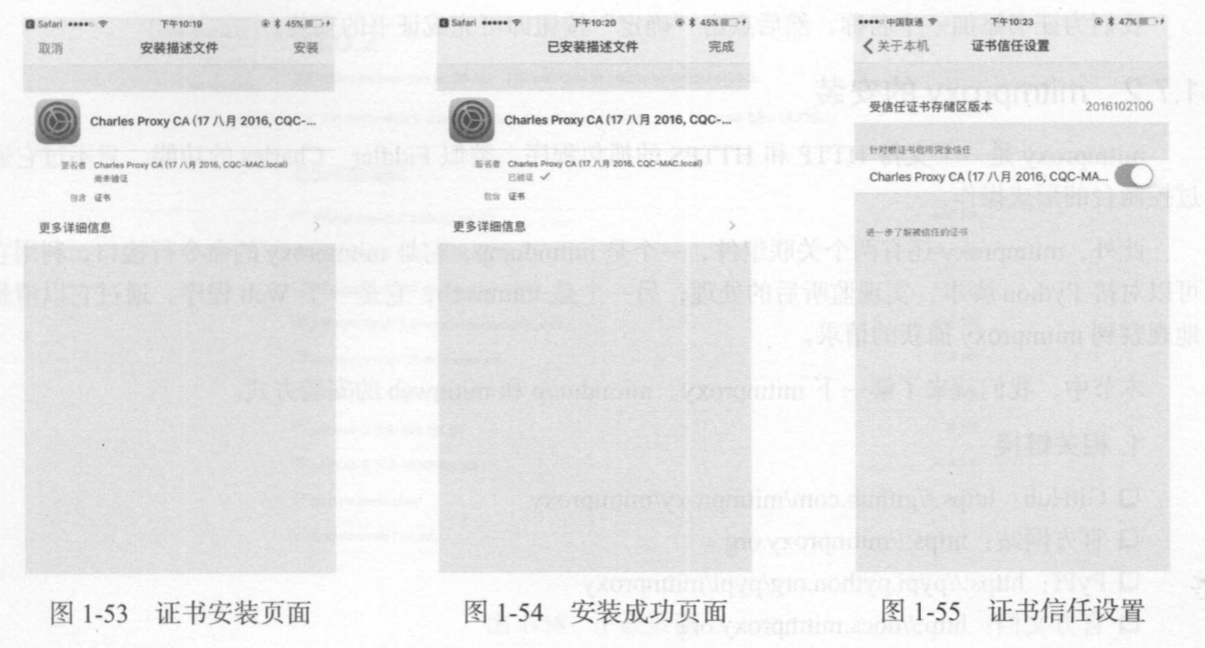 如果你的 iOS版本是 10.3及以上,还需要在“设置”→“通用”→“关于本机”→“证书信任设 置” 中将证书的完全信任开关打开,如图 1-55所示 。