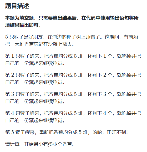 {// 请在此输入您的代码int begin=1;int before;//记录前一次猴子的四堆的总量int ans;int monkey=1;while(true){if(monkey==5) break;if(monkey==1) before=5*begin;if(before%4!=0){monkey=1;begin++;continue;}monkey++;before=before/4*5+6-monkey;}cout<