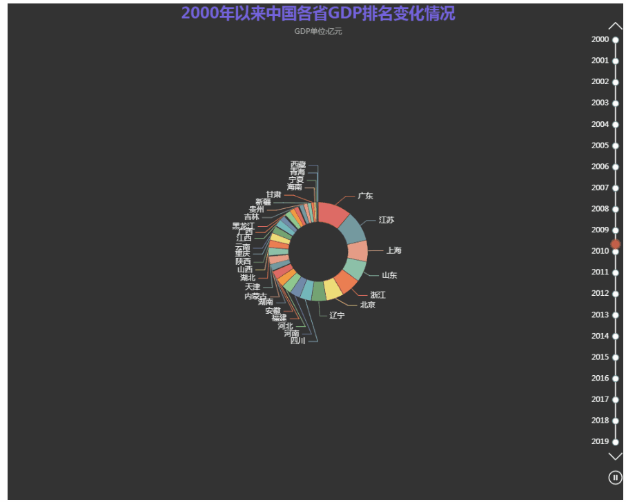 pie = (Pie(init_opts=opts.InitOpts(theme=ThemeType.DARK)).add(series_name="",data_pair=pie_data,radius=["12%", "20%"],center=["50%", "50%"],itemstyle_opts=opts.ItemStyleOpts(border_width=1, border_color="rgba(0,0,0,0.3)"),).set_global_opts(title_opts=opts.TitleOpts(title="2000年以来中国各省GDP排名变化情况",subtitle="GDP单位:亿元",pos_left="center",pos_top="top",title_textstyle_opts=opts.TextStyleOpts(font_size=25, color="rgba(123,104,238, 0.9)"),),tooltip_opts=opts.TooltipOpts(is_show=True, formatter="{b} {d}%"),legend_opts=opts.LegendOpts(is_show=False),)
