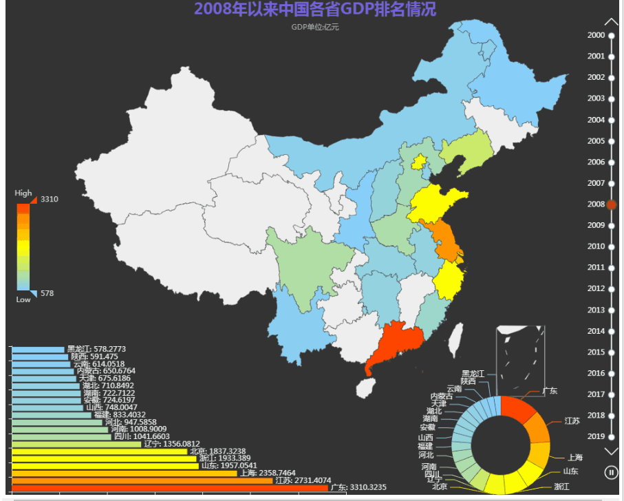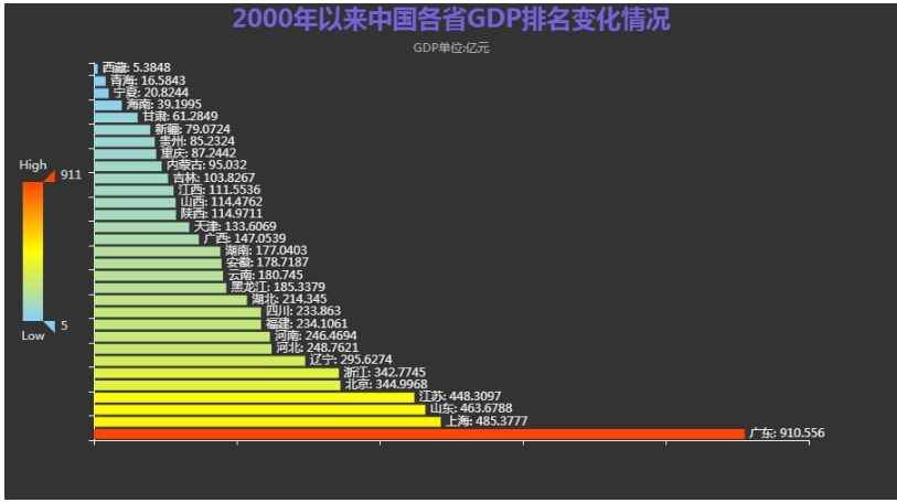 bar = (Bar(init_opts=opts.InitOpts(theme=ThemeType.DARK)).add_xaxis(xaxis_data=bar_x_data).add_yaxis(series_name="",yaxis_data=bar_y_data,label_opts=opts.LabelOpts(is_show=True, position="right", formatter="{b}: {c}"),).reversal_axis().set_global_opts(title_opts=opts.TitleOpts(title="2000年以来中国各省GDP排名变化情况",subtitle="GDP单位:亿元",pos_left="center",pos_top="top",title_textstyle_opts=opts.TextStyleOpts(font_size=25, color="rgba(123,104,238, 0.9)"),),xaxis_opts=opts.AxisOpts(axislabel_opts=opts.LabelOpts(is_show=False)),yaxis_opts=opts.AxisOpts(axislabel_opts=opts.LabelOpts(is_show=False)),tooltip_opts=opts.TooltipOpts(is_show=False),visualmap_opts=opts.VisualMapOpts(is_calculable=True,dimension=0,pos_left="10",pos_top="center",range_text=["High", "Low"],range_color=["lightskyblue", "yellow", "orangered"],textstyle_opts=opts.TextStyleOpts(color="#ddd"),min_=min_data,max_=max_data,),))