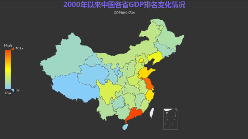 map_chart = (Map(init_opts=opts.InitOpts(theme=ThemeType.DARK)).add(series_name="",data_pair=map_data,label_opts=opts.LabelOpts(is_show=False),is_map_symbol_show=False,).set_global_opts(title_opts=opts.TitleOpts(title="2000年以来中国各省GDP排名变化情况",subtitle="GDP单位:亿元",pos_left="center",pos_top="top",title_textstyle_opts=opts.TextStyleOpts(font_size=25, color="rgba(123,104,238, 0.9)"),),visualmap_opts=opts.VisualMapOpts(is_calculable=True,dimension=0,pos_left="10",pos_top="center",range_text=["High", "Low"],range_color=["lightskyblue", "yellow", "orangered"],textstyle_opts=opts.TextStyleOpts(color="#ddd"),min_=min_data,max_=max_data,),))