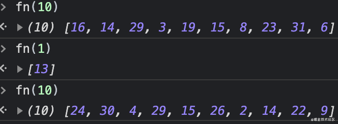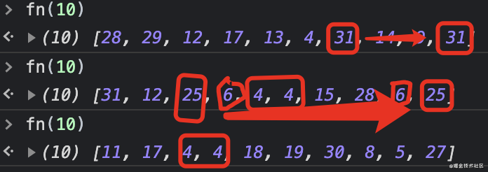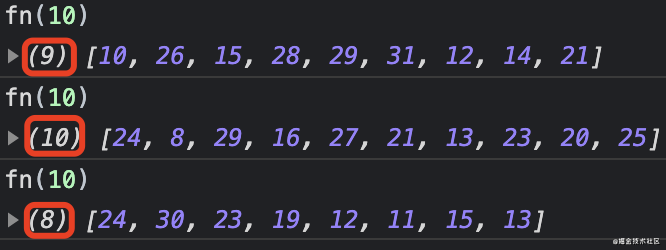 当时我的思路是这样的:假如 fn(10) 传的参数是 10,如果最终出来的数组不为 10,那就用 10 减去数组的长度,就是相差的位数了。比如 fn(10) 导致 arr.length = 8,那么 10 - 8 就代表只需要再生成 2 个随机数就可以了,但随机的两个数也可能会和现有的 8 位数组重合,所以我们要把随机生成的两位数连接到原来的 8 位数组中去,然后再用 Set 数据结构去重,用 while 循环判断,如果传进来的参数 10 减去数组长度 arr.length 不等于 0 的话就证明依然还是有重复项,那就继续再生成随机数重复刚才的步骤,直到生成 10 位所有数字都不重复的数组就会自动跳出 while 循环,然后返回这个数组: