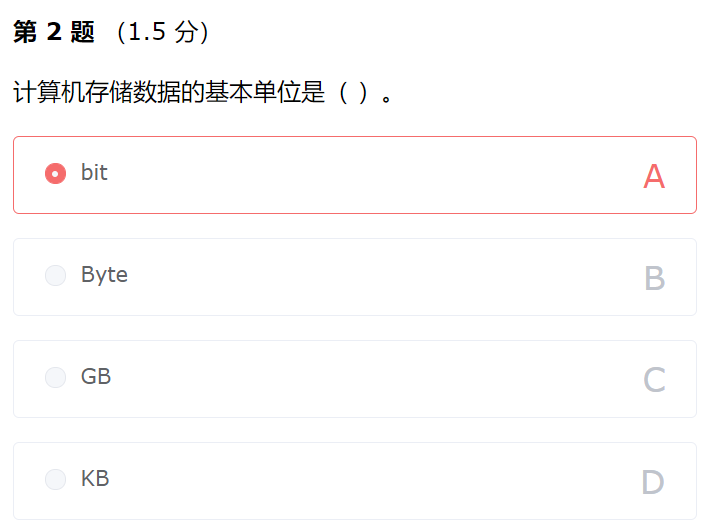 注意计算机领域当中基本存储单位与最小存储单位是不同的概念基本存储单位是字节 Byte,最小存储单位是 bit,而本题考查的是基本存储单位。