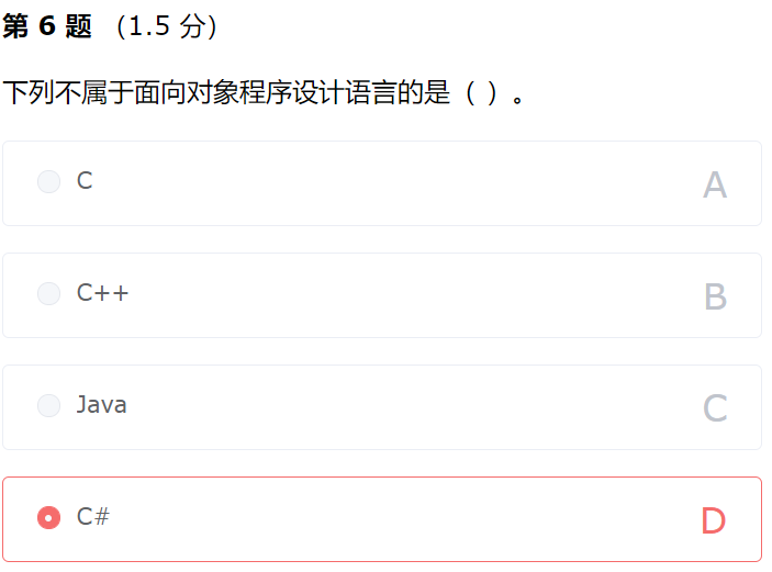 C 语言是面向过程的编程语言,其余三个都是面向对象的编程语言。