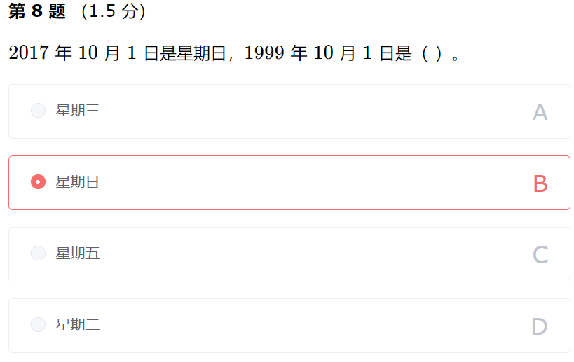 考查闰年与同余的相关知识。直接计算两个日期之间相差多少天即可,如果是 7的整数倍部分可以忽略,以降低计算难度。有些小技巧为:365mod7=1,所以两个相差一个平年的日期的星期相差 1,1999∼2017