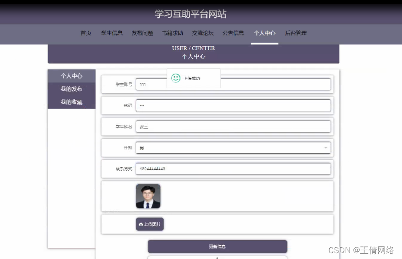个人中心,在个人中心页面通过填写用学生账号,密码,学生姓名,性别,联系方式,头像 等信息进行更新信息,根据需要对我的发布,我的收藏进行详细操作,如图5-4所示。
