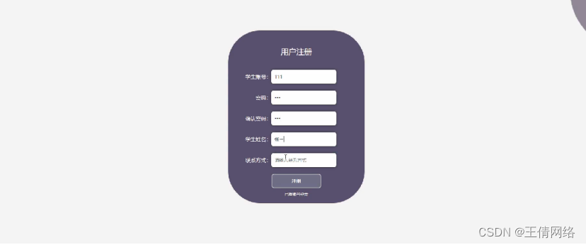 用户注册,在用户注册页面通过填写学生账号,密码,确认密码,学生姓名,联系方式等信息完成用户注册,如图5-2所示。