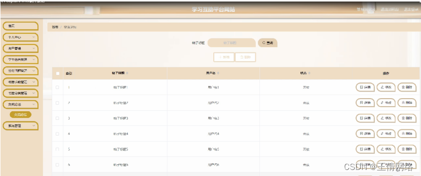交流论坛,在交流论坛页面可以对索引,帖子标题,用户名,状态等内容进行详情,修改和删除等操作,如图5-10所示。