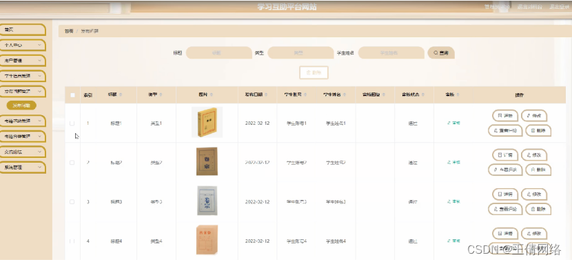 发布问题管理,在发布问题管理页面可以对索引,标题,类型,图片,发布日期,学生账号,学生姓名,审核回复,审核状态,审核等信息进行 详情,修改,查看评论和删除等操作,如图5-13所示。
