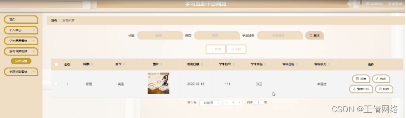 发布问题管理,在发布问题管理页面可以对索引,标题,类型,图片,发布日期,学生账号,学生姓名,审核回复,审核状态,审核等内容进行详情,修改,查看评论和删除等操作,如图5-8所示。