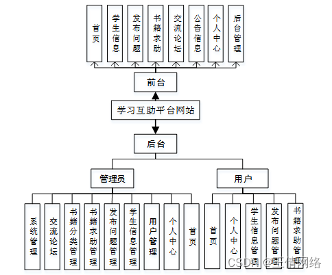 通过前面的功能分析可以将学习互助平台网站的功能分为管理员和用户两个部分,系统的主要功能包括首页,个人中心,用户管理,学生信息管理,发布问题管理,书籍求助管理,书籍分类管理,交流论坛,系统管理等内容。任何用户只要进入网站不需登录也可浏览到的信息,后台管理是针对已登录的用户看到学习信息而设计的。