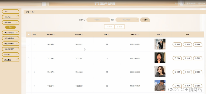 用户管理,在用户管理页面可以对索引,学生姓名,性别,联系方式,头像等信息进行详情,修改和删除等操作,如图5-7所示。