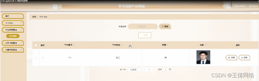 学生信息管理,在学生信息管理页面可以对索引,学生账号,学生姓名,性别,头像等信息进行详情,修改等操作,如图5-12所示。