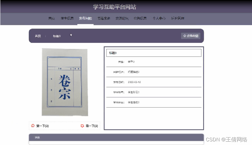 发布问题,在发布问题页面可以查看标题,类型,问题描述,发布日期,学生账号,学生姓名等详细内容,并进行添加到 赞一下,踩一下,点我收藏等操作,如图5-3所示。