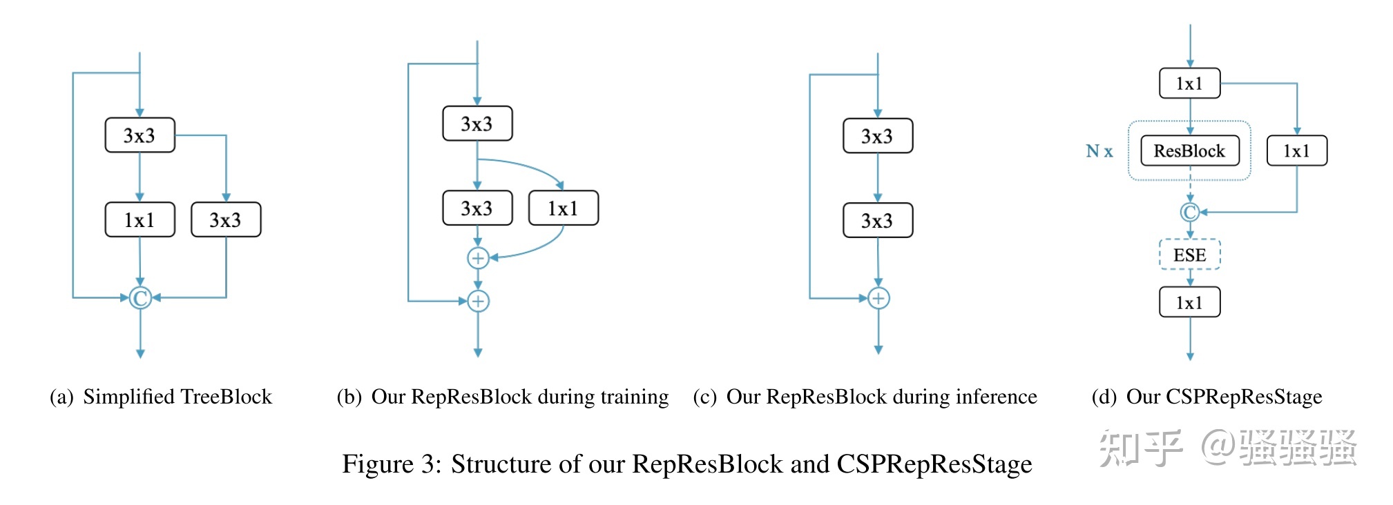 启发于TreeBlock,将残差连接和密集连接相结合,提出了一种新的RepResBlock连接,用于backbone和neck中。RepResBlock可提升精度0.7mAP。训练阶段如图3(b)所示,推理阶段如图3©所示。