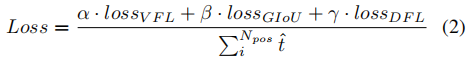 在目标检测中,分类与定位之间的任务冲突是一个众所周知的问题,相应的解决方案在许多论文中提出。YOLOX提出的头部解耦是从大多数单阶段和两阶段探测器中总结出来的,并成功应用于YOLO模型,以提高准确性。然而,解耦头可能将分类和定位任务分开,导致缺乏针对特定任务的学习。基于TOOD,我们对头部做了改进,并提出速度和准确性目标兼具的ET头。如图2所示,我们使用ESE替换TOOD中的层注意力,简化分类分支对齐的分配方式为shortcut,并将回归分支的分配方式用distribution focal loss(DFL)替换。通过上述更改,ET头只在V100上增加了0.9ms。对于分类和定位任务的学习, 我们分别选择varifocal loss(VFL)和distribution focal loss(DFL)。PP-Picodet成功将VFL和DFL应用到目标检测器中,并获得性能改善。Zhang等人方法中的VFL使用目标分数对正样本的损失进行加权,此实现使高IoU正样本对损失的贡献相对较大。这也使得模型在训练期间更加关注高质量的样本,而不是那些低质量的样本。与此相同的还有,两者都使用IoU感知分类得分(IACS)作为预测的目标。这能有效学习分类分数和定位质量估计的联合表示,这使得训练和推理之间具有高度的一致性。对于DFL,为了解决检测框表示不灵活的问题,Li等人方法建议使用通用分布预测检测框。我们的模型由如下损失函数监督: