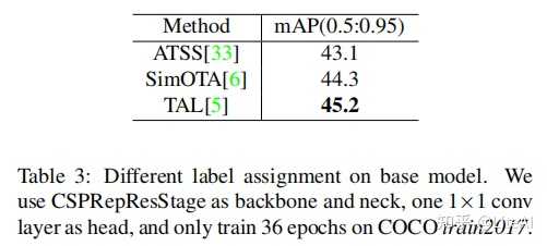 我们使用不同的标签分配策略来分析性能。我们在上述模型上进行了此实验,该模型使用CSPRepResNet作为主干。为了快速获得验证结果,我们仅在COCO train2017上训练了36个epochs,并在COCO val上进行了验证。如表3所示,TAL实现了最佳的45.2%AP性能。我们使用TAL替代FCOS风格的标签分配,并实现0.9%的AP改进–50.4%AP。