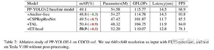 PP-YOLOv2使用anchor-based方法分配GT。然而,anchor-based机制引入了许多超参数,并依赖于手工设计,这可能导致不能很好地泛化到其他数据集。基于上述原因, 我们在PP-YOLOv2中引入了anchor-free方法。基于FCOS,在每个像素上分配一个anchor, 我们将三个检测头的上下限设置,对应到相应GT特征图。然后计算边界框的中心,以选择最近的像素作为正样本。和YOLO系列一样,预测4D向量(x、y、w、h)进行回归。这个修改使模型更快一些,同时损失0.3AP,如表2所示。虽然上下 边界是根据PPYOLOv2的anchor尺寸仔细设置的,但使用anchor-based和anchor-free的方法存在较小的不一致性,这可能会导致较小的精度下降。