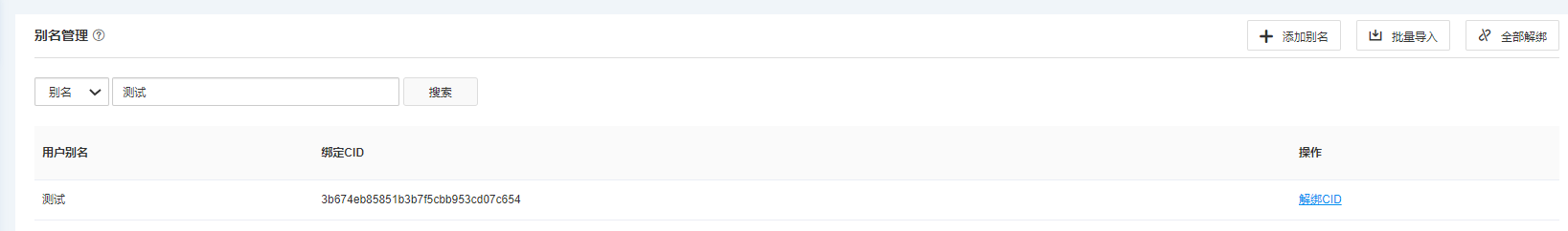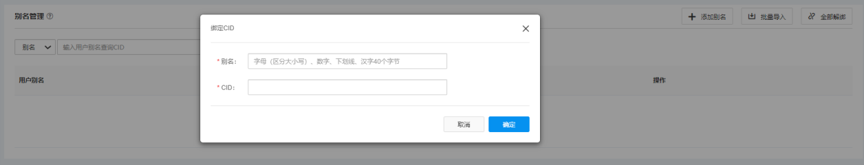 ①点击【添加别名】:输入别名和CID即可绑定别名用户。