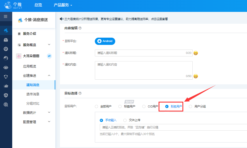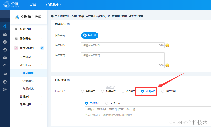 1、别名推送:别名绑定成功后,点击创建通知/透传消息-目标选择,选择【别名用户】进行消息推送。例如绑定别名用户为【测试】,输入【测试】即可圈选测试别名下的所有用户进行推送。